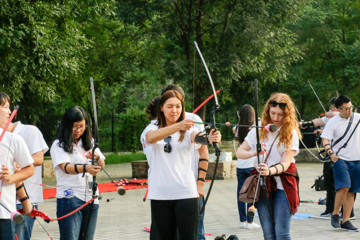 各小组展示完,拓展训练也进入到了正式的PK环节,首先进行的是“弓防箭”项目,培训师在正式开始前向同学们讲解装备使用、姿势动作及注意事项,不久便开始分队练习。同学们互相帮助,指导动作。女同学们瘦弱的肩膀变得刚强,出剑有风,巾帼不让须眉;男同学们在攻防战中斗智斗勇,轻盈闪躲,团队之前共进共退,配合有序。大家犹如置身古战场上,互相之间良好合作和沟通,互相配合完成任务,击败对手,充分地发挥团队精神。