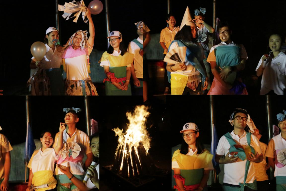 在短暂的休息过后,日落西山,黑夜来临。此时,燃起了熊熊的篝火,反串时装秀上演了。每组代表奇装异服,还配有动人的爱情故事,或浪漫,或悲情,将气氛推向了高潮。