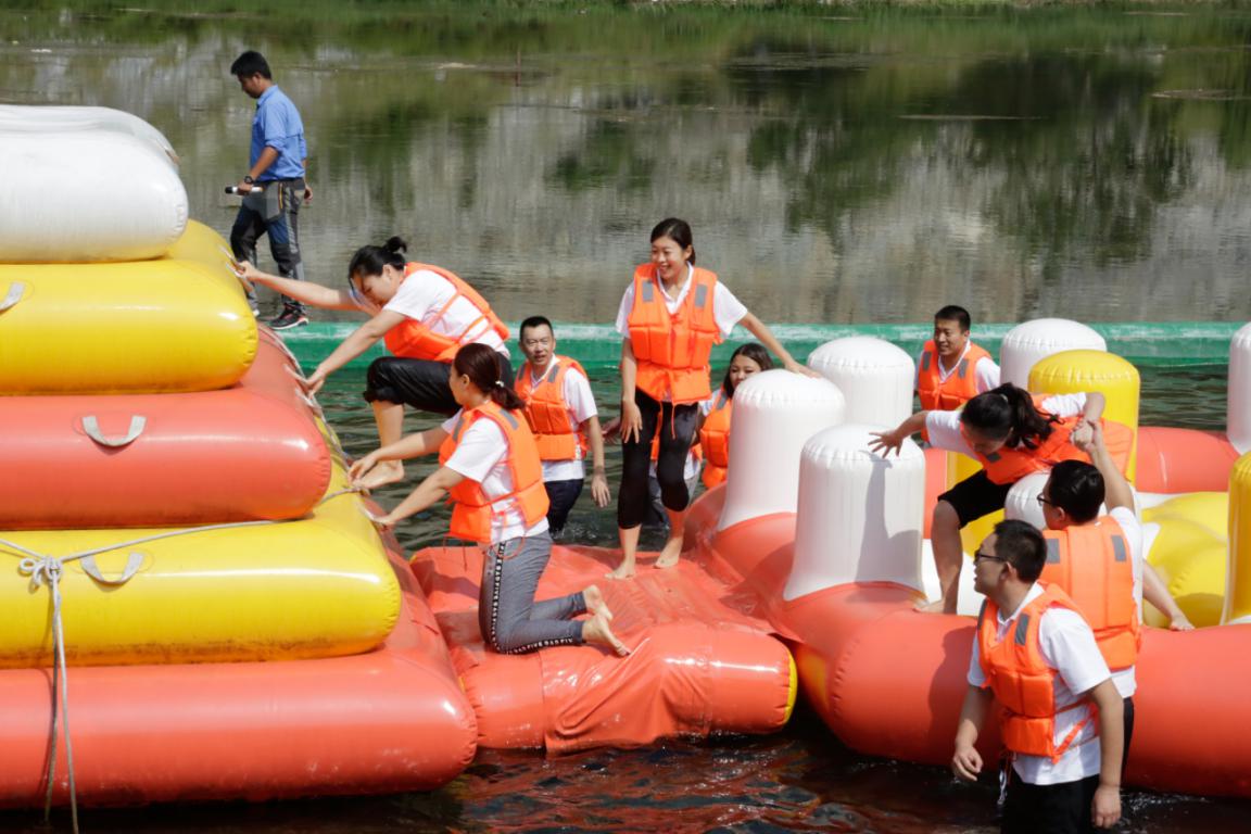 下午,同学们转战来到水上赛场冲锋现阵,接力比赛。在争分夺秒的比赛过程中,大家忘记了国籍,彼此互助,一次一次的滑倒,却屡战不待,不抛弃,不放弃,快乐向前冲,虽然衣服被弄湿、不住的呛水,但还是不气馁,一次一次的不断尝试,迎接着挑战,脸上洋溢着胜利的喜悦。