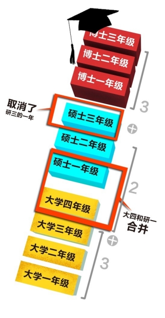 所谓“3+2+3”的项目,实际为本科读三年、硕士研究生读两年、博士研究生读三年,这样就比过去本科四年、硕士研究生三年、博士研究生三年总共缩短了两年。这两年时间,其实是“挤”出来的——把常规的大四和研一的时间合并在一起,同时取消了研三写论文的一年。