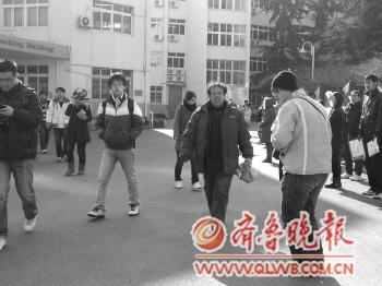 今年考试,老范被分到青岛58中考试。7日中午11点10分,在青岛58中考点,早交卷的考生陆续走出考场。在一片年轻面孔中,老范身着灰色羽绒服,手拎棕色布袋,匆匆走出,年龄和穿着与众不同,记者一眼就从人群中找到了他。