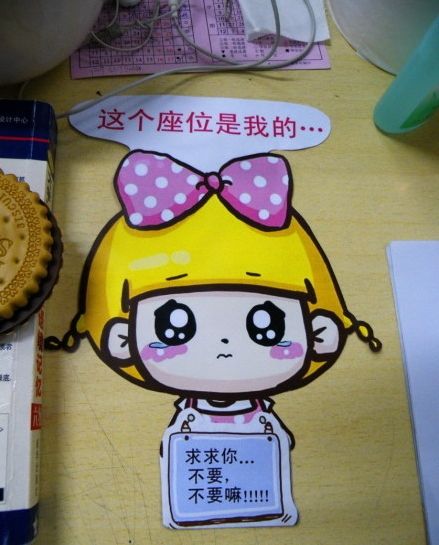 再二不过的日常:哈哈,前几天就坐了一座位,离开时发现凳子上边用透明胶带贴着“此座有人,谁坐不得好死”……