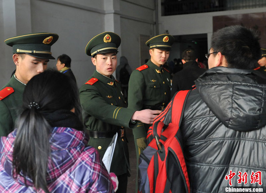 1月5日,180万考生走进考场,参加“史上最严”的2013年全国硕士研究生招生考试。本次考试部分科目将实行“一题多卷”防止作弊,同时,通讯设备一经发现携带入场即视作违规处理,作弊者将受到停止国家各类教育考试最高3年的处罚。图为1月5日早上8点,济南,浩浩荡荡的考生开始入场,武警战士负责检查证件。