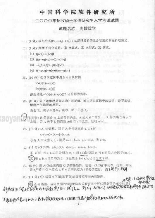 (中科院)2000年软件所离散数学试题 (中科院)2000年软件所离散数学试题 2 (中科院)2000年软件所离散数学试题 3 (中科院)2000年软件所离散数学试题 4 (中科院)2000年软件所离散数学试题 5