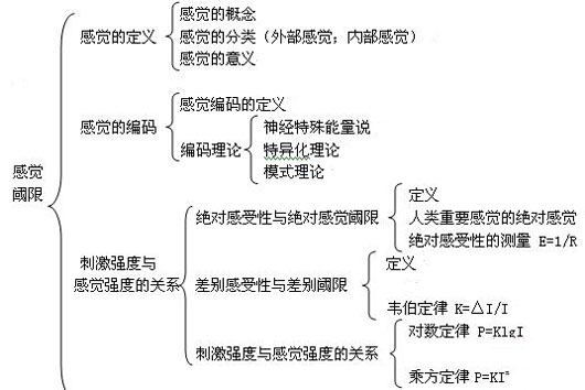 从上面的结构图可以看出,感觉这一节需要掌握三部分内容:感觉的基本概念、感觉的编码、刺激强度与感觉强度的关系(物理量与心理量的关系)。在记忆时,可以先记住结构图中的小题目,在大脑中建立起一个完整的架构。然后再分别记忆每一个分项内容。当需要提取信息时再根据大脑中的架构来提取,而不是无根据地随意乱想。
