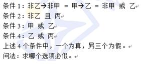 此时,条件1、3的真假就只依赖于甲的情况了,但题干中又没有给出对于甲的判断,所以条件1、3的真假是无法判断的。