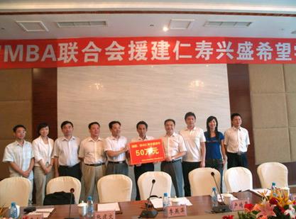 捐赠仪式上,周键同志对武汉大学EMBA/MBA联合会一行的到来表示热烈欢迎,对他们的善举表达衷心感谢,并简要介绍了四川受灾情况,特别说明了眉山等外界不多知晓的轻灾区受灾状况。吴小可在讲话中表示,"5·12"大地震给仁寿县兴盛中学造成了重大损失,对武汉大学EMBA/MBA联合会的无私援助和团省委、省青联促成此事表示衷心的感谢。全国青联委员、武汉大学经济管理学院常务副院长李燕萍则表示眉山人民自强不息的精神令人深深感动,他们将尽力帮助兴盛中学重建校园。